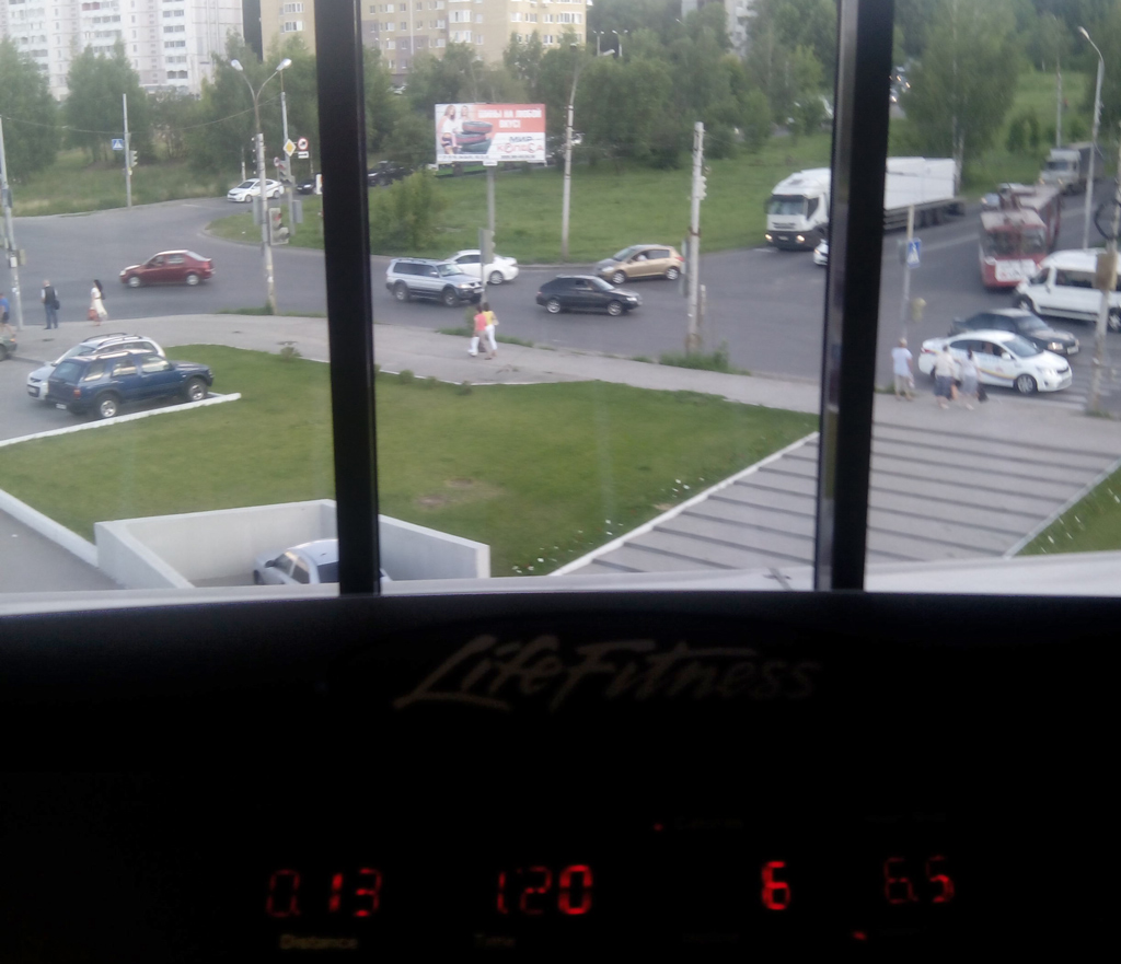 В фитнес, куда я хожу, есть большое, панорамное окно. Перед окном стоят кардио-тренажеры: беговые дорожки, лыжные тренажеры, велосипеды. То есть там ц...