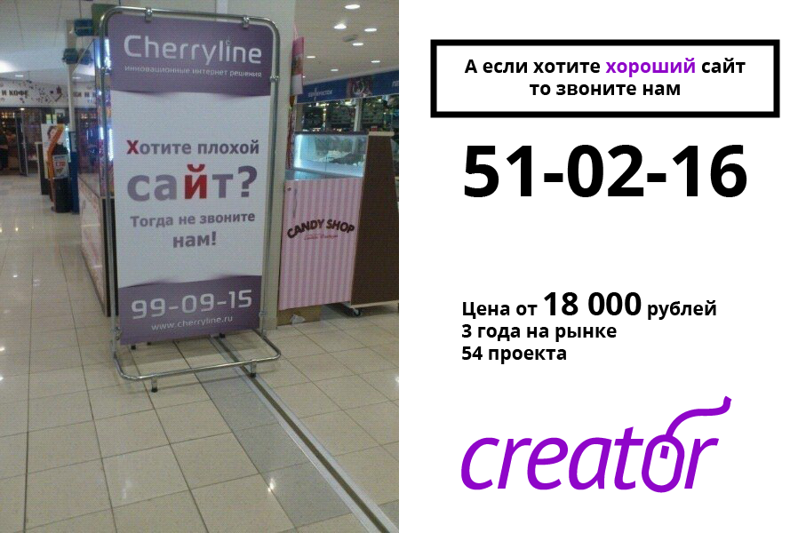 Повальное увлечение Рязанских сайтоделов оригинальной рекламой. Реклама с текстом: хочешь плохой сайт? Не звони нам. И ведь не только черрилайн отличи...